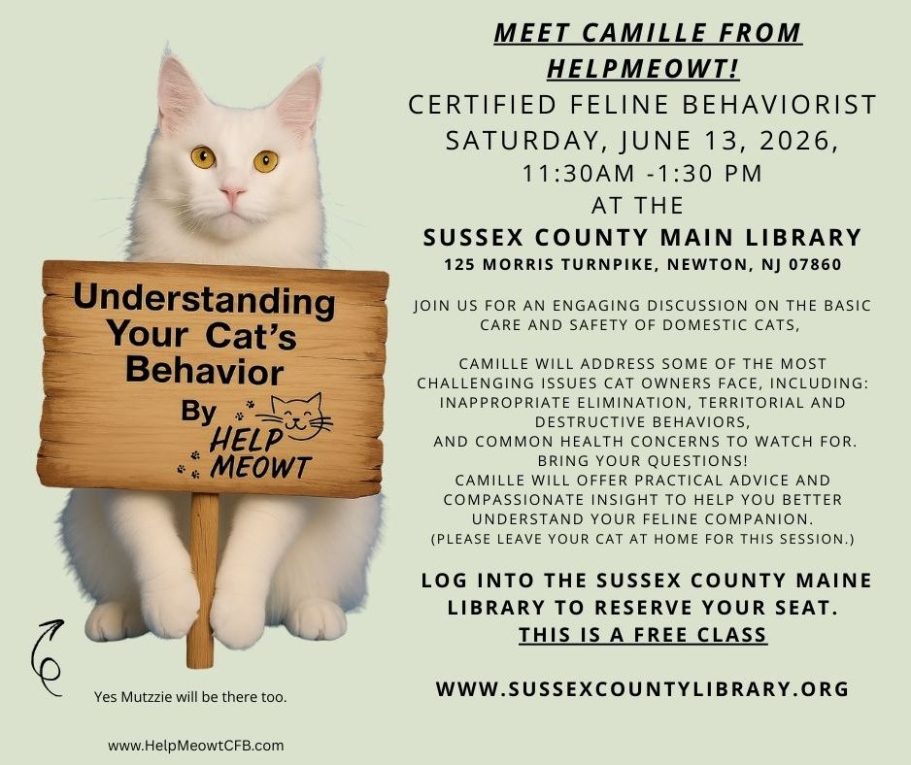 Bring your questions related to your favorite feline to be answered by Camille who is certified in Feline Training, Health & Nutrition, First Aid & CPR, Pet Massage Therapy and Fear Free. She is the owner of Helpmeowt that offers consultations and classes on cat care and behavior.
